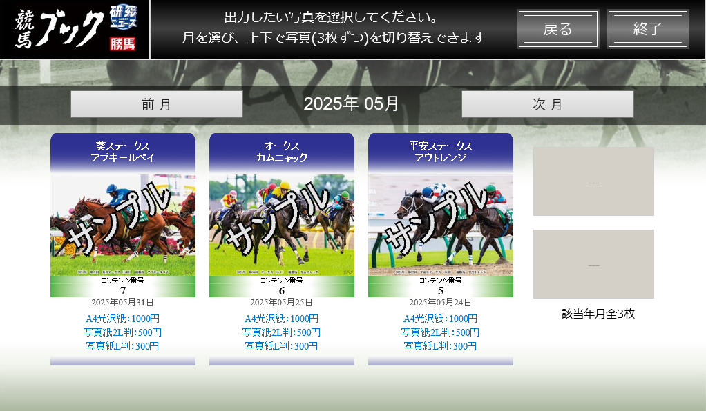 写真は、レース日付またはアップロード日付を「年・月」左右ボタンで指定し、上下ボタンで写真を探します。